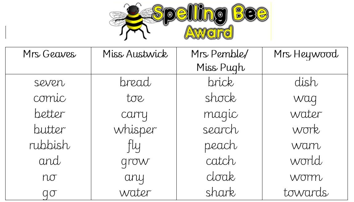 In addition to Spelling Bee, please focus on the below Year 1 and 2 Common Exception Words.