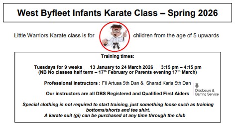Tuesday    Karate    3:15pm - 4:15pm     KS1 (Year 1 and 2)