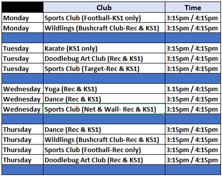 We believe that these clubs offer additional learning opportunities for your children and we encourage you to 'give it a go'. Please ensure that you read the information contained on flyers carefully and note down 'term dates' for the clubs your child is successful at being offered a place.